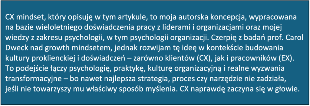 Kiedy myślę właściwym i pożądanym CX mindset – myślę o mindsecie nastawionym na rozwój (growth mindset). Opisuje on przekonanie, że zdolności można rozwijać przez wysiłek, naukę i doświadczenie. W podejściu Dweck ten rodzaj mindsetu jest bardziej adaptacyjny,  nastawiony na gotowość na zmianę i ciągły rozwój.