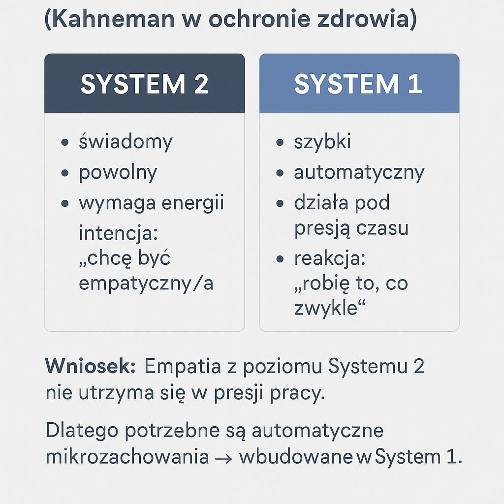 Laureat nagrody Nobla, psycholog Daniel Kahnemann w swojej książce „Pułapki myślenia. O myśleniu szybkim i wolnym”, opisuje nasz umysł, jako funkcjonujący w dwóch systemach – System 2, to myślenie wolne, świadome, wymagające wysiłku, oraz System 1, który odpowiedzialny jest za myślenie szybkie, automatyczne i intuicyjne. W kontekście pracy personelu medycznego można uznać, że świadoma empatia systemu medycznego stanowi System 2 – wymaga skupienia i uwagi. Natomiast System 1 – automatyczny, odruchowy, nie wymagający ciągłej kontroli to właśnie system związany z mikrozmianami, o których piszę. W sytuacji dużej ilości pracy, stresu, czy presji czasu dominuje u nas System 1. Dlatego jeśli empatia nie zostanie zaszczepiona w nawykach, to nawet najlepsze intencje nie wystarczą, bo będą zagłuszone przez pośpiech i rutynę.