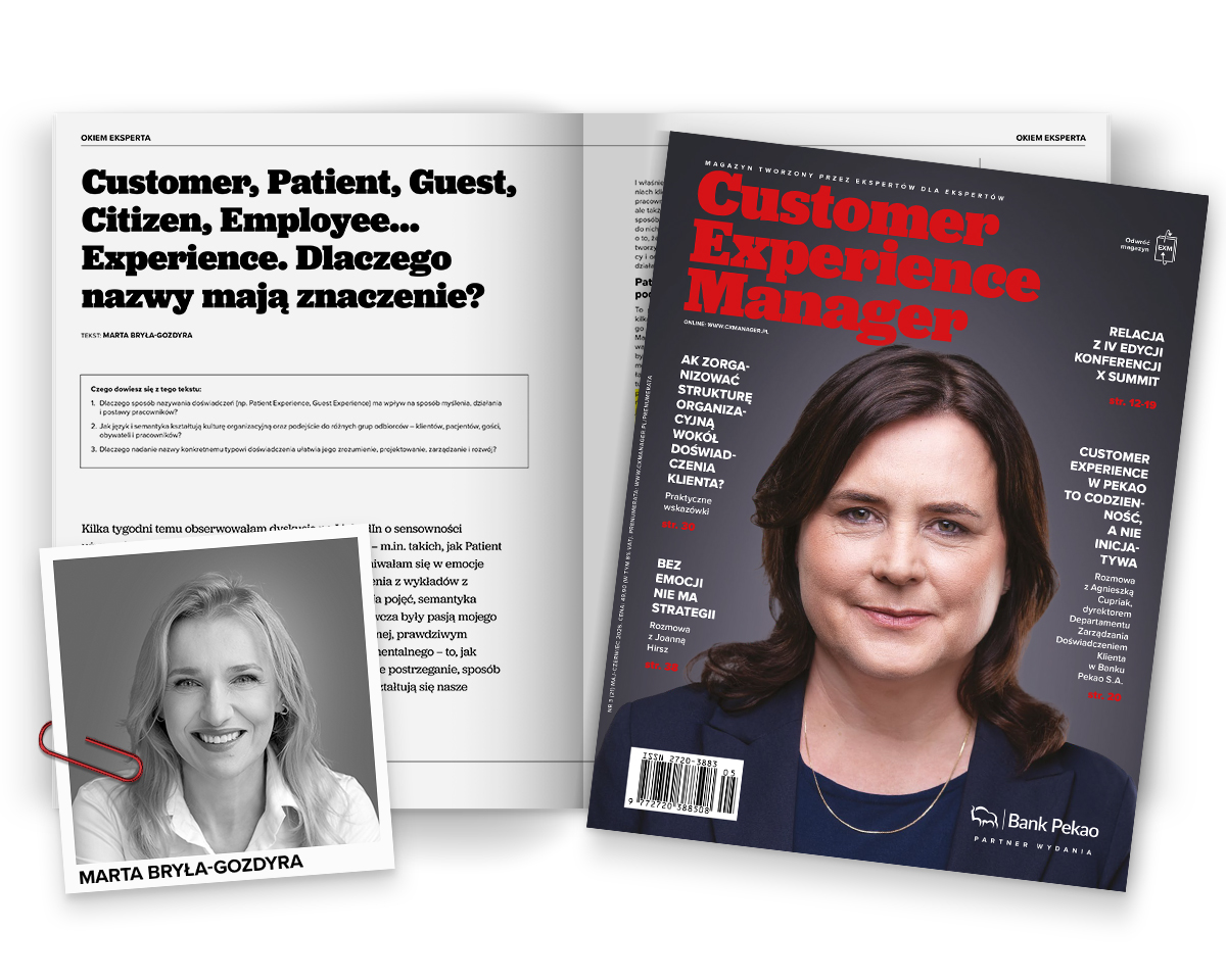 W artykule Marta Bryła-Gozdyra stawia pytanie o znaczenie nazw w zarządzaniu doświadczeniem – dlaczego mówimy Patient Experience, a nie po prostu Customer Experience? Co zmienia się, gdy używamy określeń takich jak „Patient”, „Guest”, „Citizen” czy „Employee”?